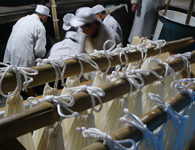 2月24日、袋しぼりが行なわれました。蔵の中は、フルーティな香りがプ〜ンと漂っています。 その日は、何も言われなくても「しぼるなぁ〜」ってわかるぐらい、みんなの行動パターンがあります!! 朝の出社は、定時より30分早くに出勤してきます。 いつもはあいている駐車場に軽トラが並んでいます。 みんな気合が入っているなぁ〜って思いながら事務所へ向かうと、袋がきれいに用意されています。 宇野杜氏が、何度も何度も洗いすすいだものです。 袋からポタリポタリとたれるお酒は、みんなの心です。 きれいに澄んだお酒は、従業員の心のしずく!! |